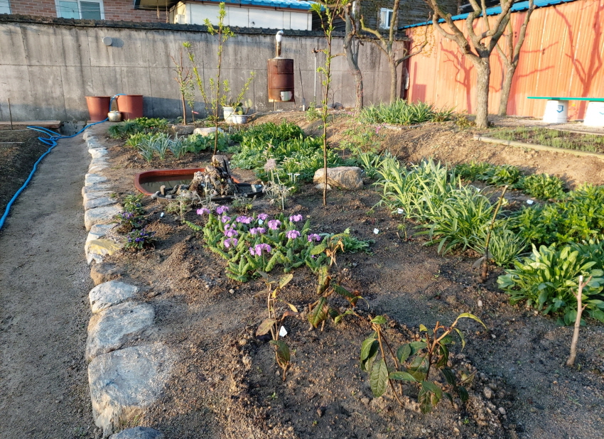 2021.3월 밭을 줄이고 화단을 늘였습니다. 화단에는 과수나무와 명자나무,차나무,앵초,깽깽이풀,금계국,마가렛,벌개미취,수련,윤판나물,금낭화,접시꽃,백양꽃,비비추,원추리,돌단풍,백리향,휴케라,옥잠화,매발톱,석죽패랭이,암대극 등을 심었는데 힐링쉼터와 함께 그린&힐링 명소로 가꾸고 있습니다.