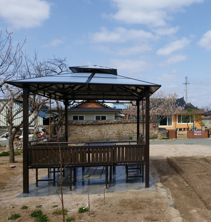 2021.3월에 새로 설치한 힐링쉼터입니다. 찾아주시는 고객님들이 편안하게 쉬고 차를 마시며 화단의 꽃을 감상할 수 있는 다목적 공간입니다.(고기 구워 먹는 장소 등)