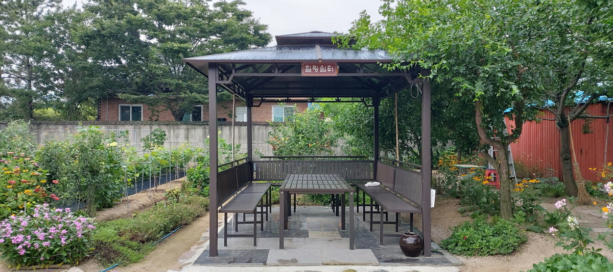 2021.3월에 새로 설치한 힐링쉼터입니다. 찾아주시는 고객님들이 편안하게 쉬고 차를 마시며 화단의 꽃을 감상할 수 있는 다목적 공간입니다.(고기 구워 먹는 장소 등)