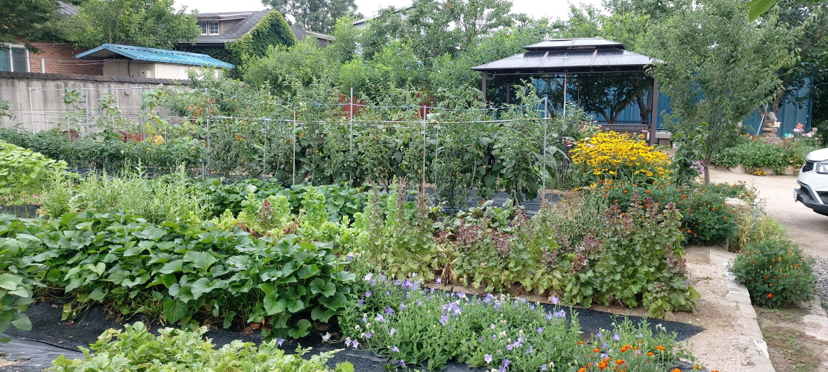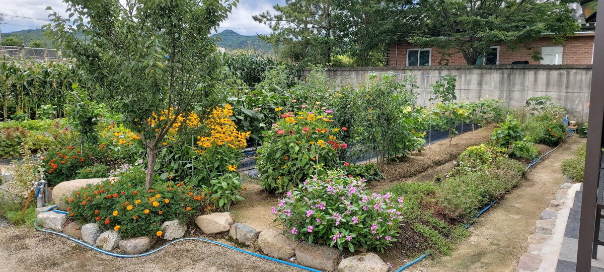 2021.3월 밭을 줄이고 화단을 늘였습니다. 화단에는 과수나무와 명자나무,차나무,앵초,깽깽이풀,금계국,마가렛,벌개미취,수련,윤판나물,금낭화,접시꽃,백양꽃,비비추,원추리,돌단풍,백리향,휴케라,옥잠화,매발톱,석죽패랭이,암대극 등을 심었는데 힐링쉼터와 함께 그린&힐링 명소로 가꾸고 있습니다.