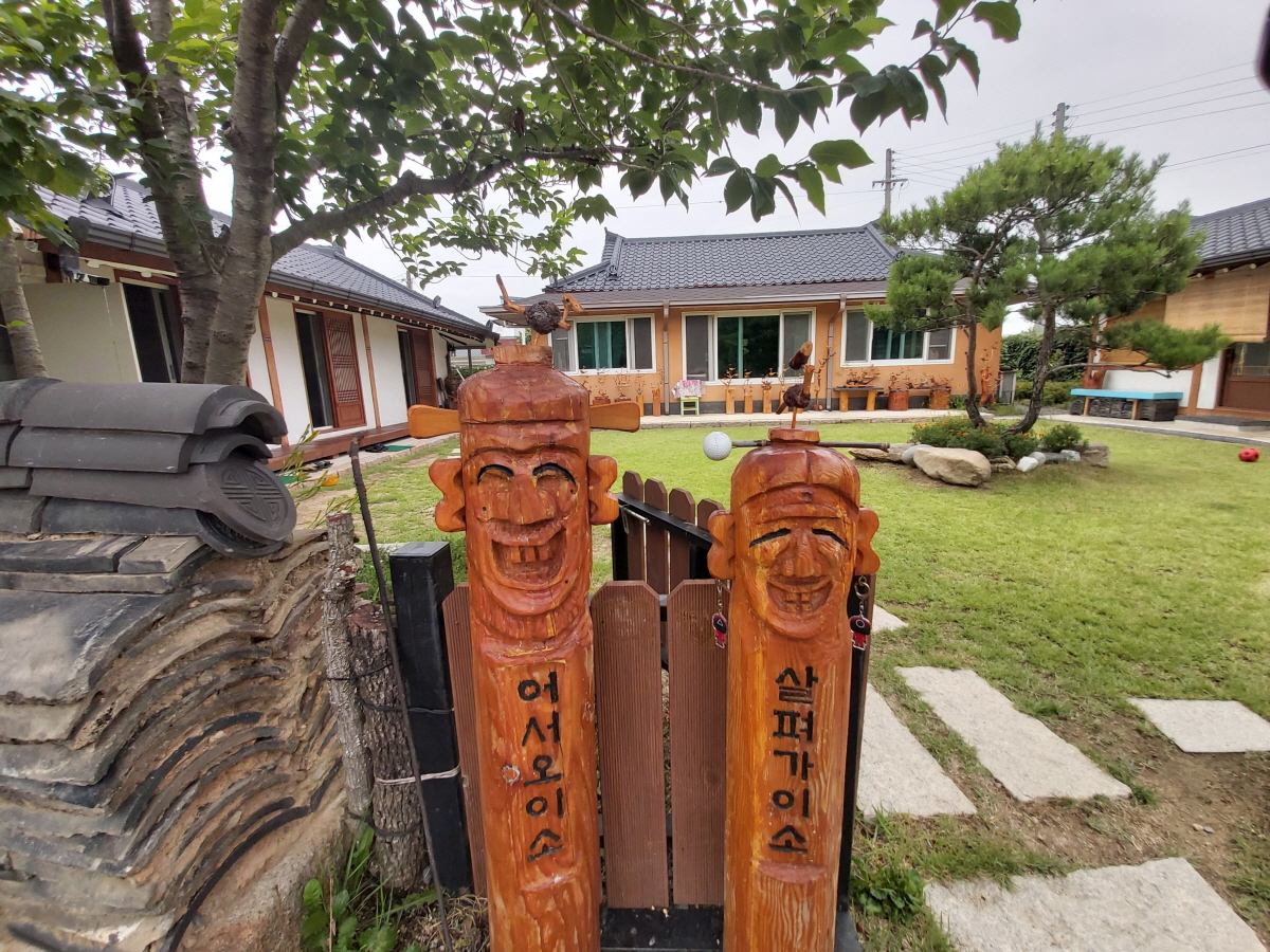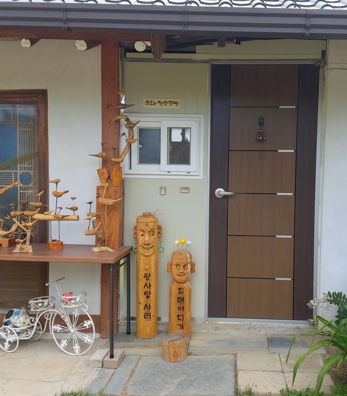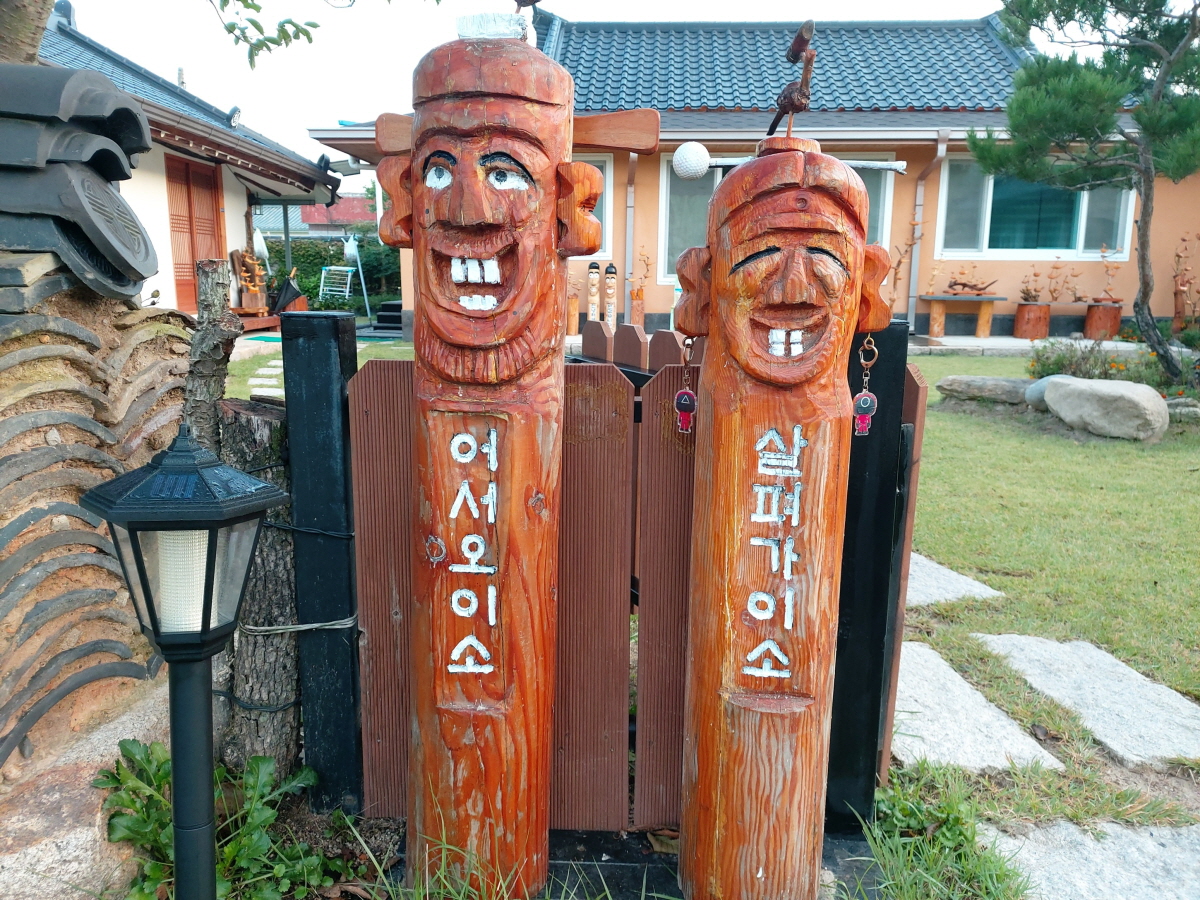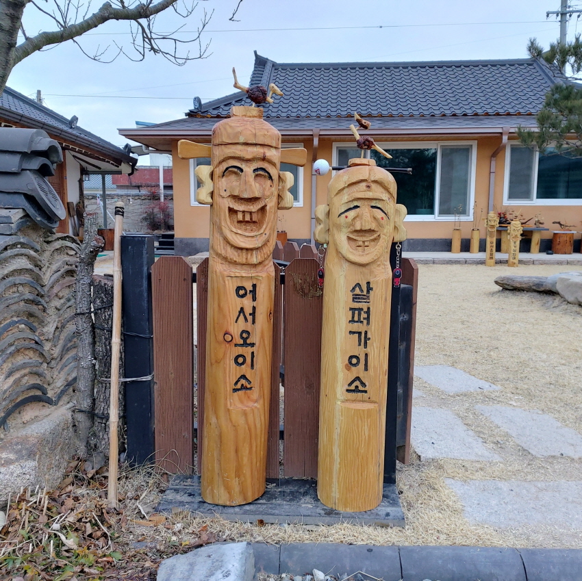 낮은 코 올리고, 귀 사이즈 줄이고, 머리 곡선부 더 깍아내고 백색 페인트 칠, 할아버지 위쪽 잇빨 갈아내고 혀 부착등 … 장승1호는 대문 앞에서 변신한 모습으로 인사 하고있다.