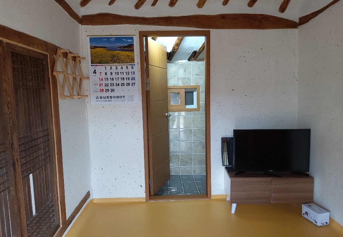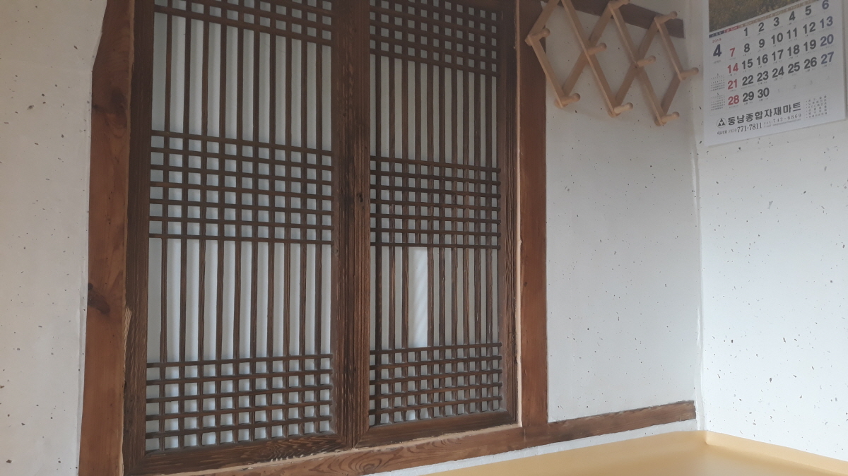 대추나무방 넓이는 2.3×2.7m 이며 화장실이 넓습니다. 주방 · 휴게실 벽쪽 한식문은 기존에 있던 문을 살렸고, 망막 롤브라인드가 설치되어 있습니다.