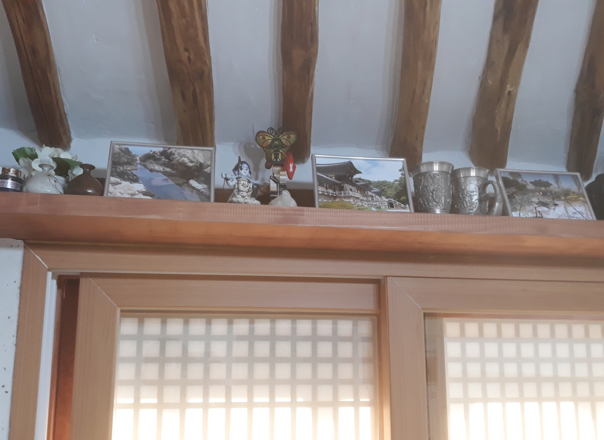 주방 · 휴게실 사용이 편리하며, 출입문 상단 선반에는 집에 있던 각종 소품과 경주 관광지 사진액자를 올려두었습니다.
